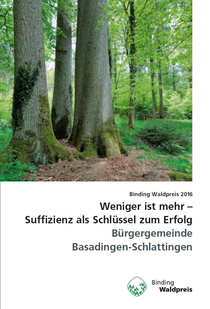 Die Bürgergemeinde Basadingen-Schlattingen TG, erhält den Binding Waldpreis 2016 in Anerkennung ihrer seit langer Zeit dokumentierten und auf dem Prinzip der Suffizienz aufbauenden Waldpflege. Der hohe Anteil an äusserst wertvollen Altbäumen visualisiert eindrücklich die Selbstbeschränkung, die sich die Bürgergemeinde in Bezug auf die Realisierung von kurzfristigen Gewinnen auferlegt hat, und den sensiblen Waldbau, der es erlaubt, die eingesetzten Mittel zu minimieren.
