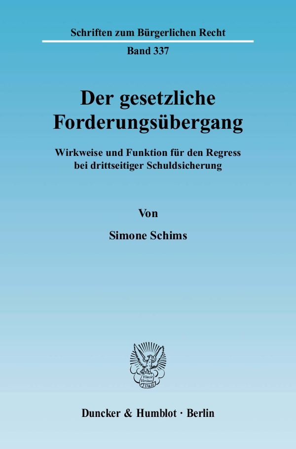 Simone Schims beschäftigt sich in der vorliegenden Arbeit mit Wirkweise und Funktion des gesetzlichen Forderungsübergangs. Nach kurzer begrifflicher Klärung analysiert sie die Übergangsanordnungen des BGB und der wichtigsten versicherungs-, sozial- und beamtenrechtlichen Normierungen. Stets dient der gesetzliche Forderungsübergang dem Regress eines Leistenden, der letztlich nicht selbst verpflichtet, sondern lediglich Sicherungsgeber eines eigentlich verpflichteten Dritten ist und so einem (gesetzlichen) Bürgen gleichsteht. Dieses Grundprinzip empfiehlt sich als Regressweg auch für gesetzlich nicht geregelte Dreipersonenkonstellationen, die sich neben dem Schadensrecht insbesondere im Bereich der akzessorischen Haftung finden. Ihre Auflösung über eine Gesamtanalogie zu den Fällen des gesetzlichen Forderungsübergangs setzt allerdings eine Regelungslücke im Regresssystem des Zivilrechts voraus, welche die Autorin nach eingehender Auseinandersetzung insbesondere mit dem Institut der Gesamtschuld und der Figur der sog. „unechten Gesamtschulden“ bejahen kann.