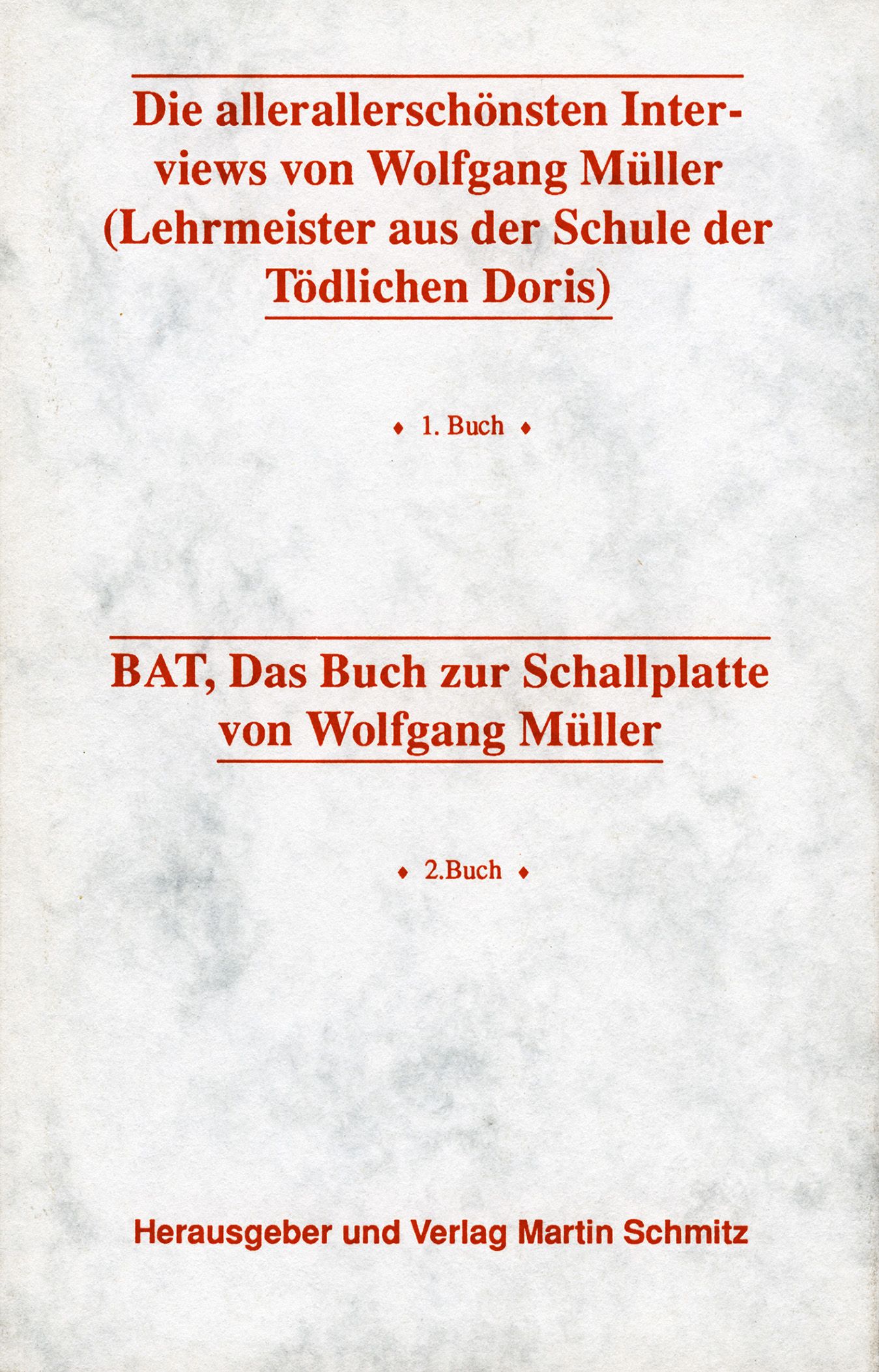 Zwei Bücher in einem! Der mit dem Allerweltsnamen versehene und an der Aller in Niedersachsen geborene Künstler Wolfgang Müller plaudert mit ganz unterschiedlichen Zeitgenossen über das Leben und die Kunst. Wir begegnen Christiane F. vom Bahnhof Zoo oder der Schauspielerin Carola Regnier, der Gruppe „Der Plan”, dem Multitalent im Schatten Reinhard Wilhelmi und vielen anderen (Lehrmeistern aus der Schule der Tödlichen Doris). Und was Michael Jackson mit der U- und E-Kunst und Fledermäusen zu tun hat, das erfahren wir in BAT, Das Buch zur ersten Soloschallplatte von Wolfgang Müller.