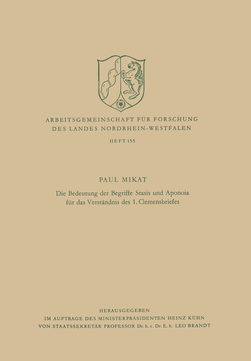 Die Publikation Die Bedeutung der Begriffe Stasis und Aponoia für das Verständnis des 1. Clemensbriefes von Paul Mikat ist bei VS Verlag für Sozialwissenschaften erschienen. Die Publikation ist mit folgenden Schlagwörtern verschlagwortet: Bedeutung, Begriff, Briefe, Clemensbrief, Stasi. Weitere Bücher, Themenseiten, Autoren und Verlage finden Sie hier: https://buch-findr.de/sitemap_index.xml . Auf Buch FindR finden Sie eine umfassendsten Bücher und Publikationlisten im Internet. Sie können die Bücher und Publikationen direkt bestellen. Ferner bieten wir ein umfassendes Verzeichnis aller Verlagsanschriften inkl. Email und Telefonnummer und Adressen. Die Publikation kostet in Deutschland 42.99 EUR und in Österreich 42.99 EUR Für Informationen zum Angebot von Buch FindR nehmen Sie gerne mit uns Kontakt auf!