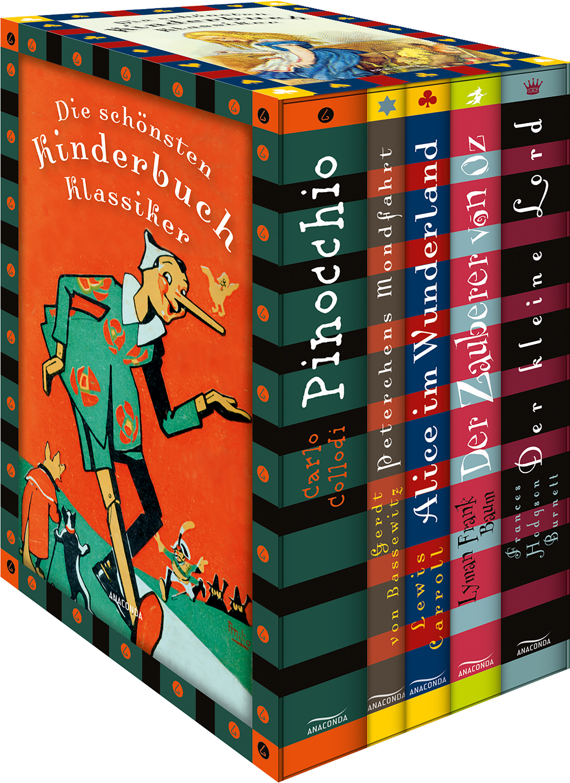 Die schönsten Kinderbücher erzählen fesselnde Geschichten und sind zugleich große Literatur. Dabei haben sie keinerlei Altersbeschränkung und faszinieren junge Leser ebenso wie junggebliebene. Diese Basisbibliothek aus fünf Bänden im Schuber kann höchsten Lesespaß praktisch garantieren. Die Namen der Autoren klingen mehr oder weniger vertraut (Frances Hodgson Burnett, Gerdt von Bassewitz, Lewis Carroll, Carlo Collodi, Lyman Frank Baum), doch ihre Werke kennt jedes Kind: »Der kleine Lord«, »Peterchens Mondfahrt«, »Der Zauberer von Oz«, »Alice im Wunderland« und »Pinocchio«.