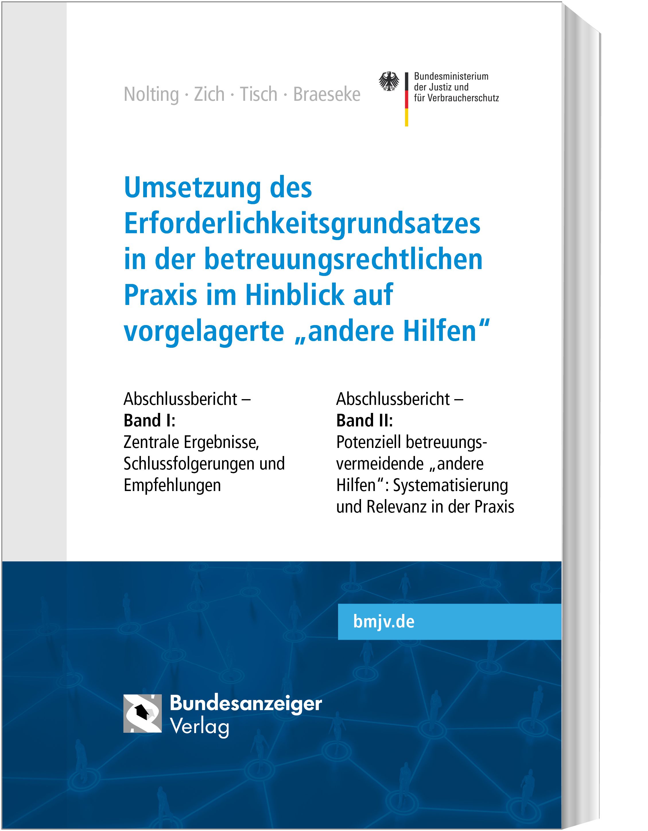 Band I: Zentrale Ergebnisse, Schlussfolgerungen und Empfehlungen: Im Mittelpunkt steht die Beantwortung der 17 forschungsleitenden Fragen und die Ableitung von Empfehlungen, wie dem Erforderlichkeitsgrundsatz in der betreuungsrechtlichen Praxis künftig noch stärker Geltung verschafft werden kann.