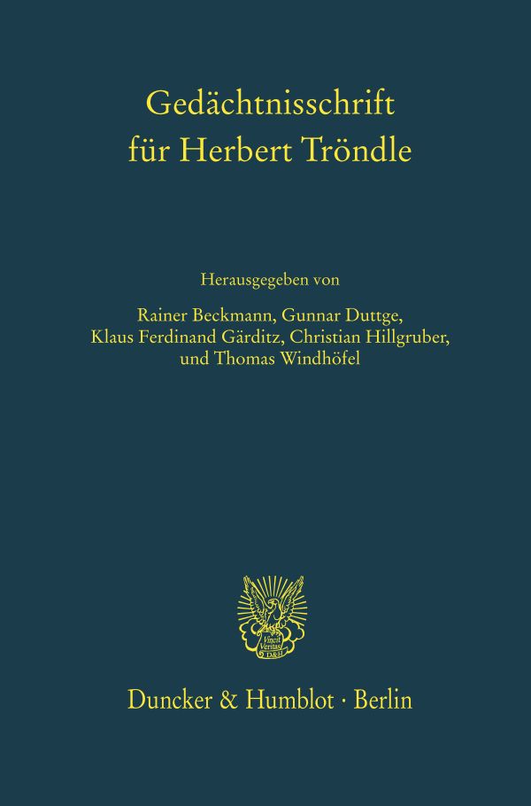 Am 1. Oktober 2017 starb der frühere Präsident des Landgerichts Waldshut-Tiengen, Prof. Dr. Herbert Tröndle, im Alter von 98 Jahren. Tröndle gehörte wegen seiner schriftstellerischen Tätigkeit, nicht zuletzt als Kommentator des StGB, als gefragter Gutachter vor dem Deutschen Bundestag und dem Bundesverfassungsgericht, aufgrund einer wirkmächtigen akademischen Lehrtätigkeit sowie durch die Kraft seiner Persönlichkeit zu den führenden deutschen Strafrechtswissenschaftlern des XX. Jahrhunderts. Am 24. August 2019 jährt sich sein Geburtstag zum 100. Mal. Aus diesem Anlass haben sich Wissenschaftler verschiedener Fachrichtungen zusammengefunden, um den Verstorbenen mit einer Gedächtnisschrift zu ehren. Der Band enthält Beiträge zu den vielfältigen wissenschaftlichen Themen Tröndles, also zum Strafrecht mitsamt seinen philosophischen und verfassungsrechtlichen Grundlagen, vor allem aber zum Schutz des menschlichen Lebens.