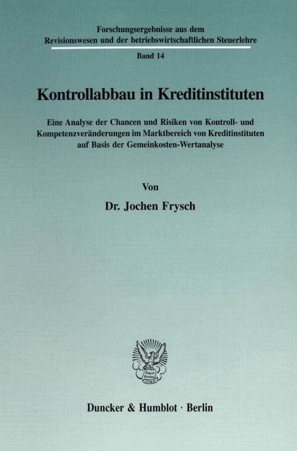 Die Publikation Kontrollabbau in Kreditinstituten. - Eine Analyse der Chancen und Risiken von Kontroll- und Kompetenzveränderungen im Marktbereich von Kreditinstituten auf Basis der Gemeinkosten-Wertanalyse. von Jochen Frysch ist bei Duncker & Humblot erschienen. Die Publikation ist mit folgenden Schlagwörtern verschlagwortet: Bank, Gemeinkosten-Wertanalyse, Kontrolle (Betriebswirtsch.). Weitere Bücher, Themenseiten, Autoren und Verlage finden Sie hier: https://buch-findr.de/sitemap_index.xml . Auf Buch FindR finden Sie eine umfassendsten Bücher und Publikationlisten im Internet. Sie können die Bücher und Publikationen direkt bestellen. Ferner bieten wir ein umfassendes Verzeichnis aller Verlagsanschriften inkl. Email und Telefonnummer und Adressen. Die Publikation kostet in Deutschland 69.9 EUR und in Österreich 71.9 EUR Für Informationen zum Angebot von Buch FindR nehmen Sie gerne mit uns Kontakt auf!