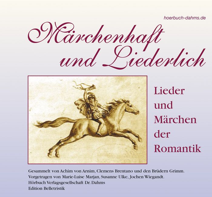 Das Hörbuch „Märchenhaft und Liederlich“ führt zurück in die Epoche der Romantik, als man begann die fast vergessenen Märchen und Lieder vergangener Jahrhunderte aufzuschreiben. Durch sie gelangen wir in Zeiten, „als das Wünschen noch geholfen hat“. Jochen Wiegandt singt und spielt Lieder aus „Des Knaben Wunderhorn“, Susanne Ulke erzählt Grimmsche Märchen und Marie-Luise Marjan führt mit Briefen von Goethe, Heine, Brentano und anderen durch die Welt der Romantik. Ein „wahrhaft zauberisches“ Hörbuch.