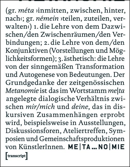1. die Lehre von dem Dazwischen / den Zwischenräumen / den Verbindungen; 2. die Lehre von dem / den Konjunktiven (Vorstellungen und Möglichkeitsformen); 3. ästhetisch: die Lehre von der sinngemäßen Transformation und Autogenese von Bedeutungen. Der Grundgedanke der zeitgenössischen Metanomie ist das im Wortstamm me|ta angelegte dialogische Verhältnis zwischen mir/mich und deine, das in diskursiven Zusammenhängen erprobt wird, beispielsweise in Ausstellungen, Diskussionsforen, Ateliertreffen, Symposien und Gemeinschaftsproduktionen von Künstlerinnen. ME|TA…NO|MIE