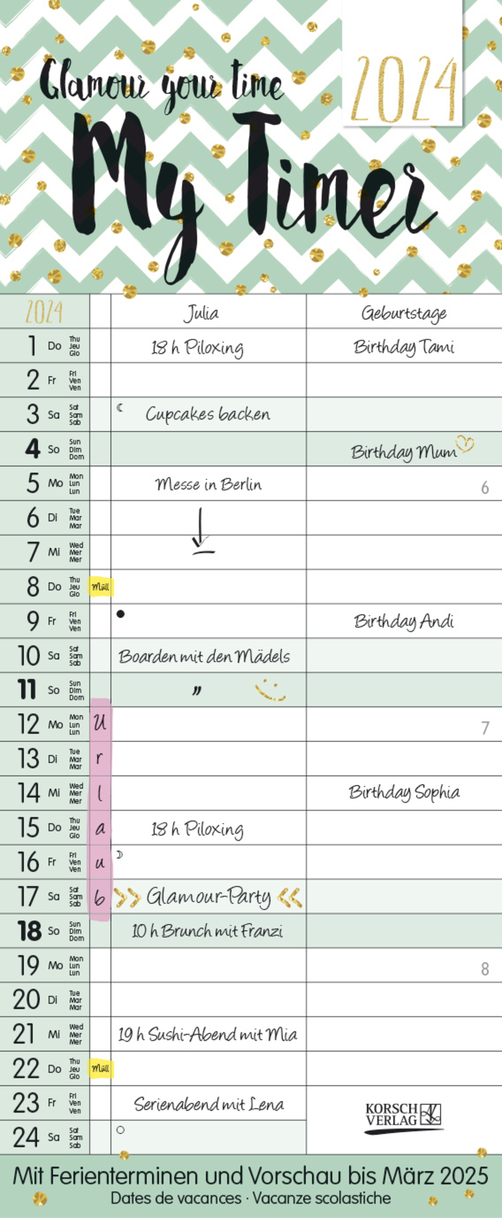 Korsch Familienkalender – Produktmerkmale Übersichtlicher Familienplaner für bis zu 2 Personen; sehr stabile Rückwand; 19 x 46 cm Terminkalender mit viel Platz für Eintragungen, ohne störende Bilder in den Spalten leichte Beschreibbarkeit, auch mit Bunt- und Bleistiften Mehrsprachiges Kalendarium (d,e,f,i) mit regionalen Feiertagen für Deutschland, Österreich und Schweiz Farblich hervorgehobene Sonn- und Feiertage, sowie Anzeige der Zeitumstellung Gedruckt auf dickem und umweltfreundlichem FSC Papier Korsch Familien – Jahreskalender Bringen Sie etwas Glamour in Ihren Alltag! Zarte Pastelltöne und edles Schwarz treffen auf geometrische Trendmuster, Typoart und Grafiken im Goldglitter-Look. Setzen Sie Ihre Termine glamourös in Szene und profitieren Sie zugleich von der hohen Funktionalität eines modernen Terminplaners. Dieser Wandkalender hilft Ihnen dabei alle wichtigen Termine stets im Blick zu haben. Mit zwei Spalten zum Eintragen von Geburtstagen, Terminen und Erinnerungen bietet dieser Jahreskalender viel Platz für Notizen. Dadurch ist es auch möglich mehrere Termine in einen Tag zu schreiben. Er eignet sich perfekt für die Organisation des Single- oder Ehelebens. Neben dem gesamten Kalenderjahr enthält der Wandplaner auch eine Vorschau bis März des Folgejahres. Weitere Informationen wie Mondphasen, Ferientermine und Feiertage (auch regionale) sowie deutlich lesbare Kalenderwochen runden den Kalender ab und sorgen für einen vollständigen Überblick Ihres Jahres.