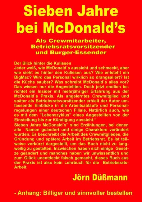 „Sieben Jahre McDonald’s“ sind Erzählungen, bei denen alle Namen geändert und einige Charaktere verändert wurden. Es beschreibt die Arbeit des Crewmitgliedes, die Gründung und spätere Arbeit im Betriebsrat. Es ist teilweise verkürzt dargestellt, um das Buch nicht zu langweilig zu gestalten. Inzwischen haben sich einige Gesetze geändert und manches haben wir unwissentlich und zum Glück unentdeckt falsch gemacht, dieses Buch aus der Praxis ist also kein Lehrbuch für die Betriebsratsarbeit.