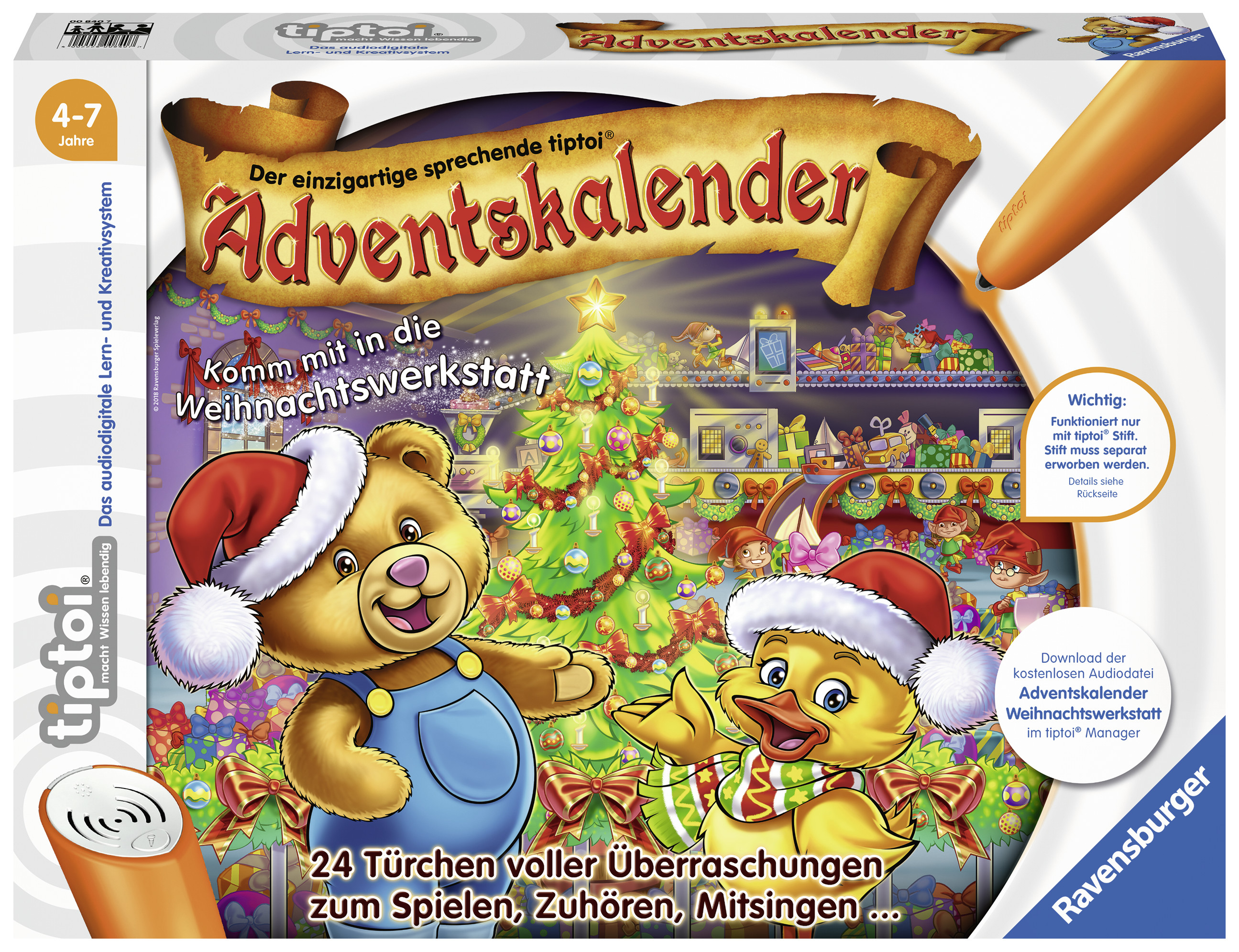 Alle Jahre wieder sammelt Bommel, der Weihnachtself, die Wunschzettel der Kinder ein und bringt sie in die geheime Weihnachtswerkstatt. Doch oh Schreck! Der Wunschzettel von Linus wird vom Schlitten herunter geweht. Ein klarer Fall für Teddy und Ente: Sie folgen Bommel in das magische Weihnachtsland, um ihm den bunt verzierten Wunschzettel zu übergeben. Schaffen sie es rechtzeitig zur Weihnachtswerkstatt, damit Linus zu Weihnachten sein Geschenk bekommt? Der einzigartige tiptoi® Adventskalender erweckt die Geschichte zum Leben. Folge Teddy und Ente auf ihrem Weg in die Weihnachtswerkstatt! • 24 Türchen voller Überraschungen zum Spielen, Zuhören und Mitsingen • Täglich eine neue Hörgeschichte • Weihnachtliche Lieder und Gedichte Spiel-Inhalt: 24 Überraschungen zum Spielen, Zuhören und Mitsingen. tiptoi® Stift nicht enthalten, muss separat erworben werden.. Spieleranzahl: 1. Spieldauer: beliebig. Spieleanleitung in deutsch.