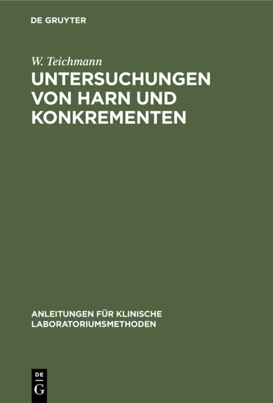 Frontmatter — Vorwort zur 1. Auflage — Vorwort zur 4. Auflage — Inhaltsverzeichnis — Einführung — 1. Allgemeines; chemische und physikalische Eigenschaften des Harnes — 1.1. Normale Zusammensetzung — 1.2. Harnentnahme — 1.3. Identifizierung einer Flüssigkeit als Harn — 1.4. Harnmenge — 1.5. Harnfarbe — 1.6. Durchsichtigkeit — 1.7. Geruch — 1.8. Dichte, Osmolalitat — 1.9. Reaktion des Harnes — 2. Chemische Untersuchung des Harnes auf pathologische Bestandteile — 2.1. Eiweiß im Harn — 2.2. Untersuchungen auf Zucker — 2.3. Acetonkörper im Harn — 2.4. Nachweis von Blutfarbstoff (Hämoglobin) — 2.5. Gallenfarbstoffe — 2.6. Porphyrine — 2.7. Gallensäuren — 2.8. Harnindikan — 2.9. Nachweismethoden seltener pathologischer Harnbestandteile — 3. Nachweis zufälliger Harnbestandteile (Arzneimittel und Gifte) — 3.1. Arzneimittel — 3.2. Gifte — 4. Bestimmung einiger normaler Harnbestandteile — 4.1. Elektrolyte — 4.2. Organische Bestandteile — 5. Funktionelle Nierendiagnostik mit einfachen Mitteln — 5.1. Verdünnungs- und Konzentrationsversuch nach Volhard — 5.2. Prüfung der Phenolsulfonphthalein-Ausscheidung (AB (D. L.) – DDR 83) — 5.3. Clearance-Methoden — 5.4. Seitengetrennte Untersuchungsverfahren — 6. Mikroskopische Untersuchung des Harnsediments — Einleitung — 6.1. Organisierte Sedimente 6.1. Organisierte Sedimente — 6.2. Nichtorganisierte Sedimentbestandteile — 7. Untersuchung von Harnsteinen (Konkrementen) — 7.1. Röntgendiffraktionsanalyse von Harnsteinen — 7.2. Weitere physikochemische Verfahren der Harnsteinanalyse — Literatur — Quellennachweis der Abbildungen — Sachwortverzeichnis
