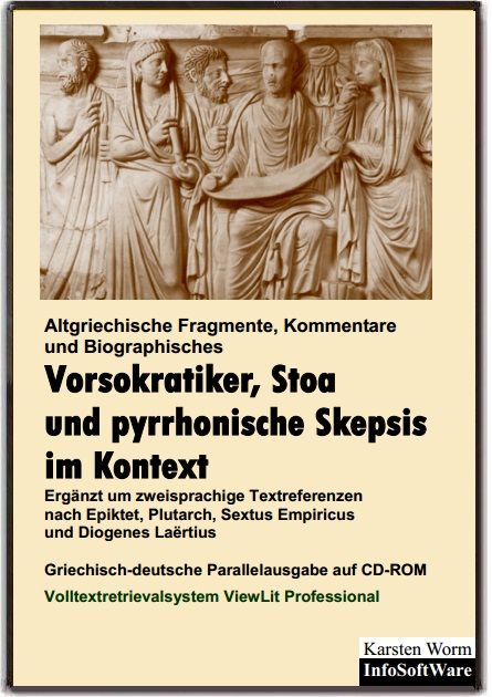Die wiedergegebene Zusammenstellung folgt den klassischen originalsprachlichen Editionen von Hermann Diels und Wilhelm Kranz „Die Fragmente der Vorsokratiker“ (inkl. der Übersetzungen Diels der hauptsächlichen Fragmentstücke) und der durch Johannes von Arnim besorgten Ausgabe „Stoicorum veterum fragmenta“ der gleichfalls nur fragmentarisch überlieferten älteren Stoa namentlich Zenons und Chrysipps. Hierzu parallel verfügbar und querverlinkte sind die sowohl in Griechisch wie in deutscher Übersetzung ungekürzten Textreferenzen nach Epiktet, Plutarch, Sextus Empiricus und Diogenes Laërtius.