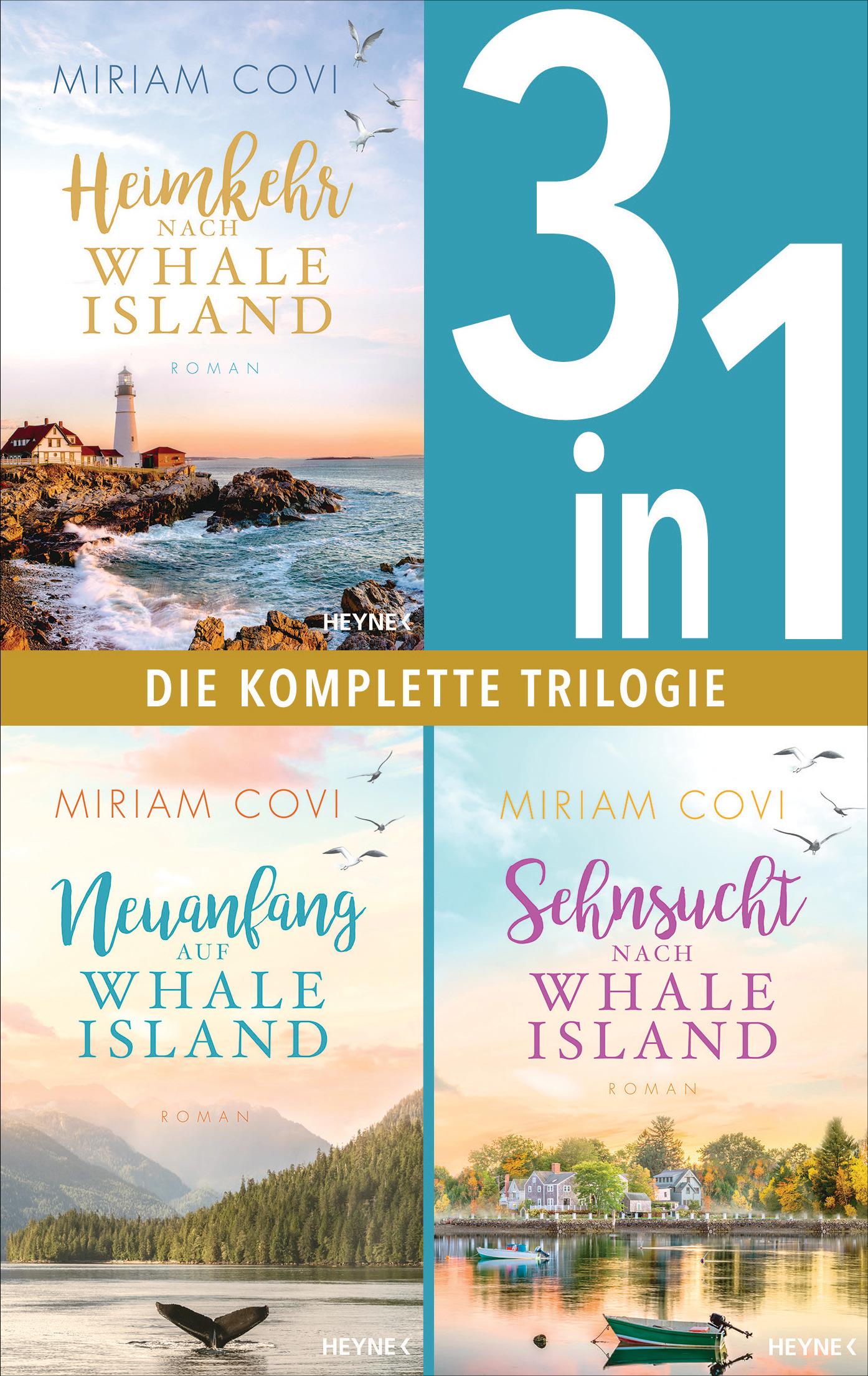Der Frauen, drei Brüder, eine sturmumtoste Insel und die ganz große Liebe. Die große Sehnsuchtsreihe von SPIEGEL-Bestsellerautorin Miriam Covi – Die komplette Trilogie in einem E-Book! Jetzt für kurze Zeit zum Kennenlernpreis (eine befristete Preisaktion des Verlags)Band 1: Heimkehr nach Whale IslandGreta Lorenz soll ihren Chef, den attraktiven aber unnahbaren Hotelmanager Duncan Sommerset, auf eine Geschäftsreise nach Kanada begleiten. Auf Whale Island, wo die Brandung an die schroffe Küste donnert und Buckelwale ihre Kreise ziehen, betreibt seine Familie ein kleines Hotel. Als Greta für Duncans Ehefrau gehalten wird, und er sie bittet, das Spiel mitzuspielen, bekommt die Reise eine ganz neue Wendung. Umgeben von herzlichen Menschen und atemberaubender Natur wird die wilde kleine Insel für Greta schnell zu dem Zuhause, nach dem sie sich schon ihr Leben lang gesehnt hat. Längst sind ihre Gefühle für Duncan echt. Doch empfindet er auch so für sie? Und warum hat er die Insel vor Jahren so überstürzt verlassen?—————————————————————————————————————————————————–Band 2: Neuanfang auf Whale IslandRestaurantmanagerin Stella Minetti hofft auf einen gelungenen Neustart in der Cameron Lodge auf Whale Island. Doch von einer entspannten Atmosphäre ist in dem charmanten Inselhotel zunächst wenig zu spüren, denn die temperamentvolle Halbitalienerin gerät immer wieder mit dem ebenso hitzigen Chefkoch Aidan Cameron aneinander. Dass sie sich trotz allem zu ihm hingezogen fühlt, macht alles noch viel komplizierter. Dann taucht plötzlich der attraktive Sänger Jackson Porter auf und macht Stellas Gefühlschaos perfekt. Doch warum sucht er hier auf der abgeschiedenen Insel Zuflucht? Und wie wird sich Stellas Herz entscheiden?——————————————————————————————————————————————————Band 3: Sehnsucht nach Whale IslandBloggerin Viola lebt jeden Tag als könnte es ihr letzter sein – schließlich hat in ihrer Familie noch keine Frau ihren 35. Geburtstag gefeiert. Während einer Rucksacktour durch Kanada hat sie einen Unfall. Doch als sie im Krankenhaus erwacht, ist sie tatsächlich 35 und die Zukunft liegt plötzlich vor ihr. Krankenschwester Skye Cameron lädt sie ein, sich bei ihr auf Whale Island zu erholen. Auf der kleinen Insel inmitten des tosenden Atlantiks fühlt sich Viola so wohl wie noch nie zuvor. Liegt das nur an der faszinierenden Natur? Oder auch an Skyes jüngstem Bruder Glenn, dem schüchternen, aber attraktiven Schriftsteller? Viola ahnt nicht, dass sie mehr mit Whale Island verbindet, als sie sich je hätte vorstellen können.