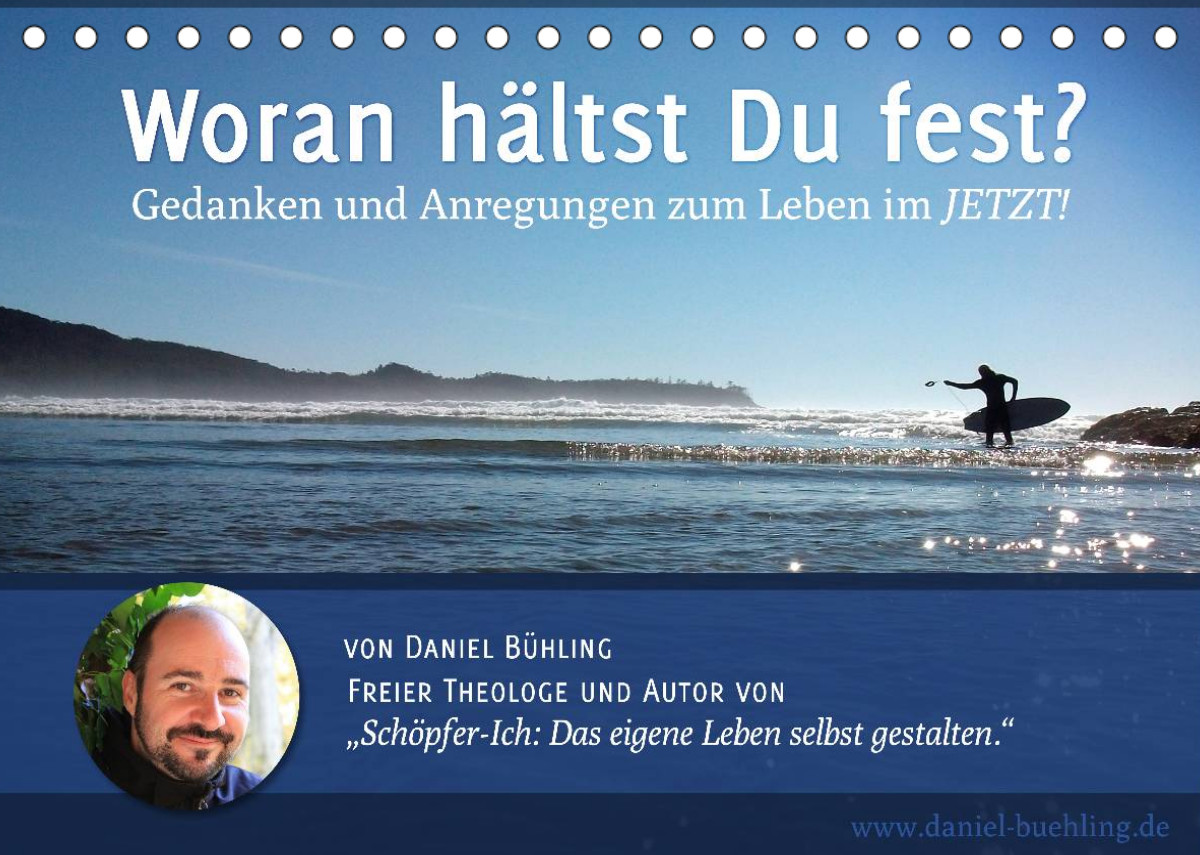 Unser Leben ist in einem ständigen Fluss, der uns ständig mit neuen Herausforderungen konfrontiert. Dabei geraten wir immer wieder in Versuchung, die Schuld an unerwünschten Situationen im Außen zu suchen. Die Kraft unser Leben zu ändern und auf die Wunschziele zu lenken, liegt jedoch einzig in uns selbst. Lassen sie sich von den Anregungen zu zwölf typischen Lebensfragen des freien Theologen Daniel Bühling inspirieren, die der Autor des Buchs „Schöpfer-Ich: Das eigene Leben selbst gestalten“ für Sie zusammengestellt hat. Ein stimmungsvolles Foto, das sorgfältig zum jeweiligen Gedanken ausgewählt wurde, lädt Sie jeden Monat ein, den Alltag für eine kleine Traumreise zu pausieren.