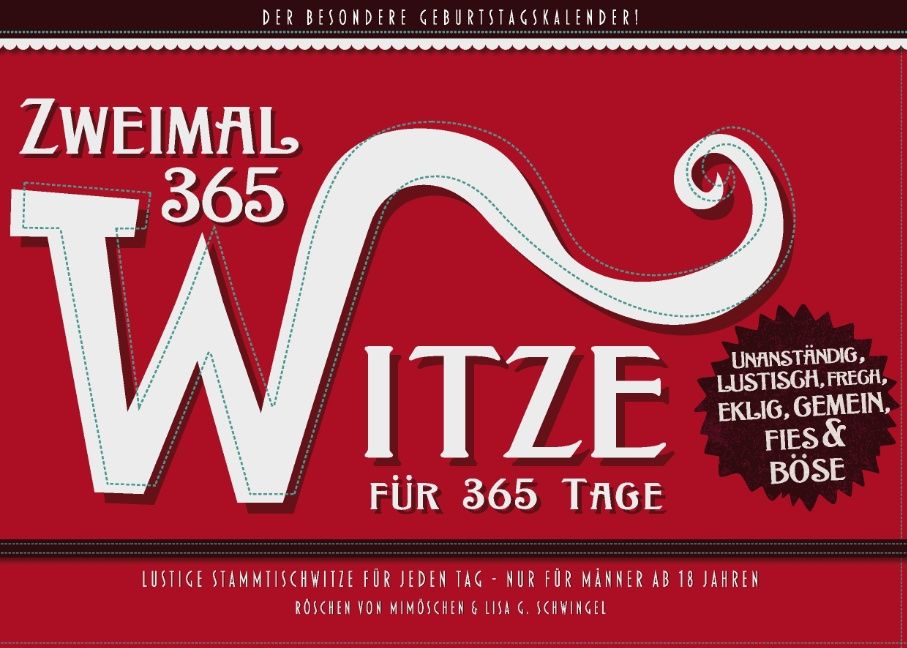 Fast 800 Witze, die meist knapp oder auch deutlich unterhalb der Gürtellinie liegen, inclusive des schönsten Märchens der Welt, sind in diesem Kalender-Witzbuch zusammgefaßt. Im Durchschnitt ist doppeltes Lachen für jeden Kalendertag garantiert. Die zum Teil sehr unanständigen Witze wurden zusammengesammelt in vielen Stammtischrunden, den finsteren Ecken des World Wide Web, auf Schulhöfen, bei Betriebsfeiern, auf Kegelausflügen, bei Walpurgisnachtfeiern (mit Hexenverbrennungen), auf dem Ballermann usw.Das Buch ist nur geeignet für robuste Männer und solche, die es werden wollen. Die Herausgeberinnen empfehlen ein Mindestalter von 18 Jahren für die Lektüre. Und Ihr solltet das Buch vor Euren Frauen, Lebensabschnittsgefährtinnen und Freundinnen versteckt halten. Nehmt es mit zu den Kumpels, zum Stammtisch, zur Männergeburtstagsrunde, zum Kegelklubausflug oder zum Männertagsausflug und lacht Euch schlapp. Ihr könnt Euch natürlich auch beim Schwiegervater beliebt und bei der Schwiegermutter unbeliebt machen, wenn Ihr das Buch zum nächsten Geburtstag oder gar zum Hochzeitstag als Geschenk überreicht.Infos auch unter www.zweimal-365-witze.de